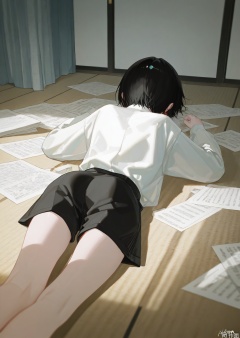 solo, short hair, shirt, black hair, long sleeves, 1boy, white shirt, male focus, lying, shorts, indoors, from behind, black shorts, on stomach, paper, facing away