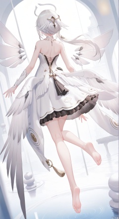 1girl, solo, long hair, hair ornament, dress, bare shoulders, full body, white hair, wings, barefoot, white dress,strapless, halo, floating,from behind,soles,