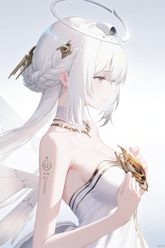 1girl, solo, long hair, hair ornament, dress, bare shoulders,white hair, wings,white dress, grey eyes, strapless, halo,gentle smile,upper body,gentle expression,soft gentle eyes,parted lpis,from side,