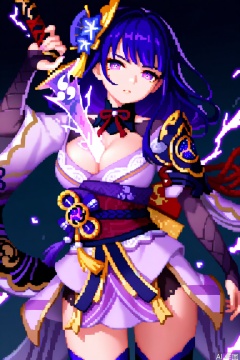 cowboy shot, 1girl, raiden shogun, holding sword,between breasts, head tilt, serious, hand up, looking at viewer, parted lips, wind, dark background, electricity, sparks,