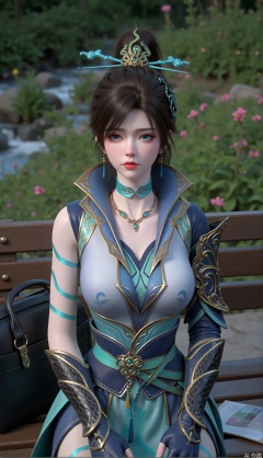She sat gracefully on the outdoor bench, under which there was a black schoolbag and a flipped magazine next to it. The background is a green garden with lush flowers and plants and a stream, and the overall atmosphere is fresh and natural.