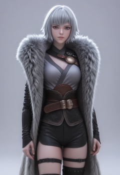 score_9,high detail,best quality,cinematic lighting,volumetric lighting,shiny skin,shiny,1girl,solo,armor,thigh strap,grey eyes,breasts,belt,fur coat,short hair,white hair,white background,shorts,simple background,closed mouth,thighhighs,standing,lips,cowboy shot,sheathed,looking at viewer,<lora:QQSponybaiyuekuiV1:0.8>,<lora:Pony_DetailV2.0:0.8>,<lora:皮肤凹痕:0.1>,