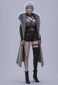 score_9,high detail,best quality,cinematic lighting,volumetric lighting,shiny skin,shiny,1girl,solo,armor,thigh strap,grey eyes,breasts,belt,fur coat,short hair,white hair,white background,shorts,simple background,closed mouth,thighhighs,standing,lips,full_body,sheathed,looking at viewer,high heel boots,single thighhigh,<lora:QQSponybaiyuekuiV1:0.8>,<lora:Pony_DetailV2.0:0.8>,<lora:皮肤凹痕:0.1>,