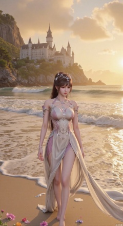 SFW,(masterpiece:1.2),best quality,3d anime style, cg,absurdres,masterpiece,original,extremely detailed wallpaper,perfect lighting,official art, A young woman in embroidered qipao standing barefoot on golden sandy beach, colorful flowers around feet, ocean waves washing over feet, white medieval castle with pointed towers resembling Neuschwanstein Castle perched on steep cliff in background, golden sunset rays piercing through clouds, ultra-wide angle composition with detailed foreground sand textures, dynamic mid-shot of figure interacting with waves, three-dimensional castle structure in background, high saturation colors, 8K resolution, precise depth of field control, HDR lighting, surreal elements blended with photorealistic details, realistic water reflections, intricate silk fabric texture, castle floating in mist atmosphere,(huge breasts:2.99),(full breasts:2.99),Xhenge,Xshisanyi