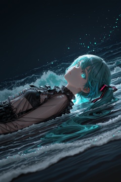 by lack|fuzichoco|lam|kinta \(distortion\)|wlop|quasarcake|nixeu,dark theme, black background, bioluminescence, phytoplankton, ocean, waves, scenery, 1girl, partially submerged, aqua eyes, cyan glow, glowing, glowing eyes, see-through shirt, crying with eyes open, looking at viewer, expressionless, colored eyelashes, jirai kei, hatsune miku, twintails, on back, from side, masterpiece, best quality, very aesthetic, absurdres