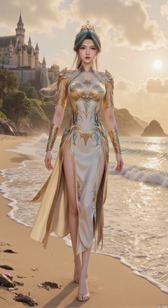 SFW,(masterpiece:1.2),best quality,3d anime style, cg,absurdres,masterpiece,original,extremely detailed wallpaper,perfect lighting,official art, A young woman in embroidered qipao standing barefoot on golden sandy beach, colorful flowers around feet, ocean waves washing over feet, white medieval castle with pointed towers resembling Neuschwanstein Castle perched on steep cliff in background, golden sunset rays piercing through clouds, ultra-wide angle composition with detailed foreground sand textures, dynamic mid-shot of figure interacting with waves, three-dimensional castle structure in background, high saturation colors, 8K resolution, precise depth of field control, HDR lighting, surreal elements blended with photorealistic details, realistic water reflections, intricate silk fabric texture, castle floating in mist atmosphere,(huge breasts:2.99),(full breasts:2.99),Xhenge,Xshisanyi