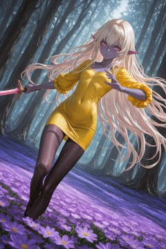 masterpiece,best quality,amazing quality,very aesthetic,absurdres,newest,highres,stu dts:0.5,arsenixc:0.5,dramatic lighting BREAK dark elf,grey purple skin tone,hot pink eyes,petite,very long white blonde hair,forest meadow of flowers,holding sword,large rune sword BREAK dynamic motion,fighting stance,dutch angle,yellow shirt,black_pantyhose,pencil_dress,