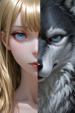 masterpiece,best quality,amazing quality,very aesthetic,absurdres,newest,highres,yoneyama mai:0.5,nixeu:0.5,next to a big stone,behind the big rock is a 1 wolf,the wolf with a sinister expression,face close-up,wolf,golden hair,blue eyes,split theme,stylish,artist,
