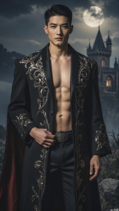 In a dark and mysterious atmosphere, a pale and cold male model stands like a vampire. He is wearing a gorgeous Gothic robe with its corners fluttering gently in the wind. His eyes are crimson, and his fangs slightly protrude. Behind him is a gloomy castle with dark clouds covering the moon, full of mystery and horror.xnz,hor
