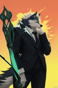 The image depicts a stylized anthropomorphic wolf character with blue fur and white hair. The wolf is wearing a formal outfit consisting of a dark suit, a light-colored dress shirt, and a tie. The background is a gradient of light yellow and white, creating a warm and neutral backdrop. The wolf has a serious expression, with its eyes looking slightly downward. There is a green sword or staff behind the wolf, adding a sense of purpose or authority to the character. The overall style is reminiscent of digital art, with clean lines and vibrant colors.wolf furry,SVG FURRY