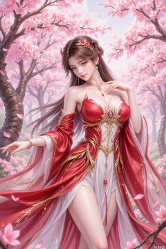 The image depicts a serene and ethereal scene with a woman dressed in an elaborate red and white gown. The gown features intricate gold designs and flowing fabric that gives a sense of movement and grace. The woman is surrounded by lush pink cherry blossom trees, which create a soft and dreamy atmosphere. The background is filled with more cherry blossoms, enhancing the overall magical and tranquil feel of the scene. The lighting is soft and diffused, with subtle highlights that emphasize the delicate details of the gown and the blossoms.