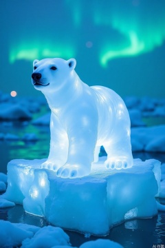 Polar Bear on an Ice Floe: A majestic polar bear carved from ice, standing on a floating ice floe.   The background is the Arctic Ocean, with icebergs and the Northern Lights casting a mystical glow.
