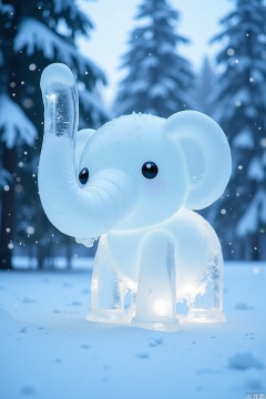 Ice Elephant in a Snowy Forest: An ice elephant, its trunk raised high, standing amidst a forest of snow-covered trees.   The background is a winter wonderland, with snowflakes falling gently.