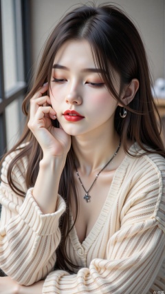The image shows a young woman with long, dark hair, wearing a light-colored, knitted sweater. She has a delicate necklace with a small pendant. Her eyes are closed, and she is resting her chin on her hand, with her lips painted a bold red. The background is blurred, making the subject stand out prominently.