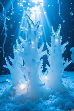 Ice Coral Reef: An underwater scene of ice coral, with ice fish and other marine life frozen in time.  The background is a frozen ocean floor, with ice bubbles and a shaft of light from the surface.