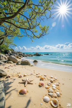 The image depicts a serene beach scene with a clear blue sky and fluffy white clouds. The ocean is calm with gentle waves lapping against the sandy shore. Large rocks are visible in the water near the shore, and there are seashells scattered on the sand, including a starfish and several conch shells. The sunlight is bright, casting a warm glow over the entire scene. The text "AI" is visible in the bottom right corner of the image.