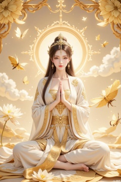 The image depicts a serene and ethereal scene with a woman dressed in flowing white robes adorned with intricate golden patterns. She is seated cross-legged on a lotus flower, exuding a sense of tranquility and spiritual focus. Her hands are clasped together in a prayer-like gesture, and she wears a delicate tiara that complements her serene expression. The background is a soft, glowing golden hue, with delicate clouds and floating butterflies adding to the dreamlike atmosphere. The overall composition is reminiscent of traditional East Asian art, with a focus on spiritual and mystical themes.
