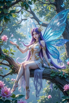 The image depicts a fairy sitting on a tree branch in a mystical forest setting. The fairy has large, translucent blue wings and is adorned with intricate, flowing garments in shades of white, purple, and gold. Her hair is long and purple, styled with delicate floral accessories. The fairy is surrounded by glowing orbs and butterflies, and there are vibrant pink flowers and green foliage in the background. The scene is bathed in a soft, ethereal light, giving it a magical and serene atmosphere.