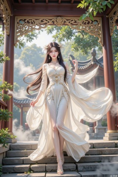 The image depicts a serene and ethereal scene with a woman standing on stone steps. She is dressed in a flowing white gown that billows gently, creating a sense of movement and grace. Her hair is long and adorned with delicate accessories, and she appears to be in a state of calm contemplation. The background features ornate architectural elements, including intricately carved pillars and a structure that suggests a traditional East Asian setting. Wisps of mist surround her, enhancing the mystical atmosphere. The overall composition is harmonious, blending natural and man-made elements seamlessly.