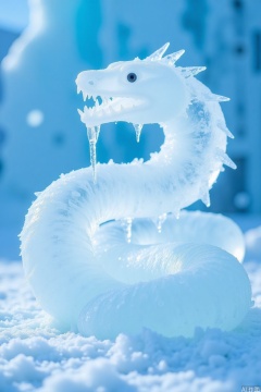 ice carving,ice carving,A white snake,snowice,Ice sculpture architecture,crystal clear,blue sky with snowflakes,white mist shrouded image,surreal,high-definition photography,16k,high-definition picture quality,