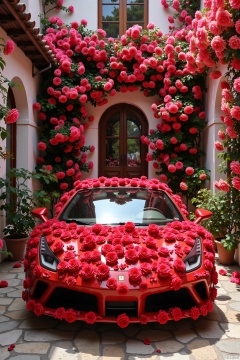 A sleek, modern red sports car, completely decorated with red roses, flowers covering the entire car,Behind it is a white villa, with lush green plants on either side, the white building covered in vines and blooming red flowers.