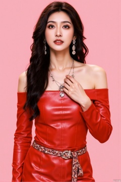 Elegant, free and easy, charming woman, sharp eyes, flowing long curly hair, wearing a rose-red glossy off-shoulder skirt, a rose-red glossy belt, exquisite earrings and necklaces, fashionable, generous, front-facing shooting, high-definition photography, full-body photos, 8K movies, pink background, super high quality, top picture quality, visual feast.