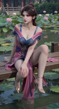 SFW,(masterpiece:1.2),best quality,The image is a digital illustration of a young woman sitting on a wooden bench in a pond with lily pads. She is wearing a long dress with design on the chest and sleeves. The dress has a high neckline and short sleeves,Holding a lotus in hand. She has long dark hair styled in loose waves and is wearing gold high heels. The woman is posing with one hand on her hip and the other resting on the edge of the bench. The background is filled with pink and white lotus flowers and green leaves. The overall mood of the image is peaceful and serene,(huge breasts:2.99),(full breasts:2.99),(Background with traditional Chinese architecture, lotus pond and pink lotus flowers:1.39),XtianqiongY,XliumeiY,XyueliuY,Xxiaowu,Xyusanniang,Xxuenv