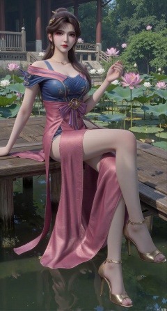 SFW,(masterpiece:1.2),best quality,The image is a digital illustration of a young woman sitting on a wooden bench in a pond with lily pads. She is wearing a long dress with design on the chest and sleeves. The dress has a high neckline and short sleeves,Holding a lotus in hand. She has long dark hair styled in loose waves and is wearing gold high heels. The woman is posing with one hand on her hip and the other resting on the edge of the bench. The background is filled with pink and white lotus flowers and green leaves. The overall mood of the image is peaceful and serene,(huge breasts:2.99),(full breasts:2.99),(Background with traditional Chinese architecture, lotus pond and pink lotus flowers:1.39),XtianqiongY,XliumeiY,XyueliuY,Xxiaowu,Xyusanniang,Xxuenv