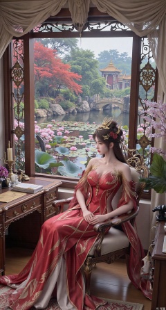 SFW,(masterpiece, best quality:1.2),1girl, solo, long dress,Ancient princess's boudoir with bright color palette,,(huge breasts:2.39),(full breasts:2.39), Hanfu-clad maiden sitting by latticed window desk in romantic daydreaming posture, classical Chinese garden through window showcasing lotus pond filled with blooming pink and white lotuses, delicate ink-wash painting style, interior featuring rosewood furniture with mother-of-pearl inlay, silk curtains fluttering in breeze, porcelain stationery set on desk, distant view of curved bridges and pavilions in garden, ultra HD rendering with crisp details on embroidered garments and translucent lotus petals,,(huge breasts:2.99),(full breasts:2.99),,XtianqiongY,XliumeiY,XyueliuY,Xxiaowu,Xyusanniang,Xxuenv,XhuolingerHHY