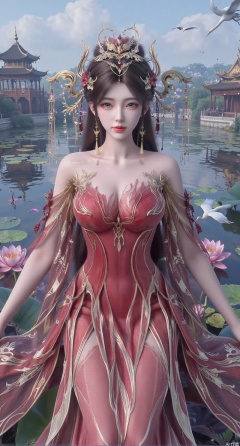 SFW,(masterpiece:1.2),best quality,1girl,solo,long hair,long dress,celestial maiden in flowing tulle gown levitates above lotus pond, ethereal mist trails from hair ribbons, mythical Penglai paradise emerges through clouds with glowing pavilions, translucent bioluminescent lotus blooms, flock of cranes gliding over water surface, ultra HD with soft 3D rendering, morning light filters through mist, falling petal rain, intricate details on scale-patterned fabric and lotus veins.(huge breasts:2.99),(full breasts:2.99),,XtianqiongY,XliumeiY,XyueliuY,Xxiaowu,Xyusanniang,Xxuenv