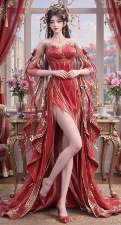 Ultra clear, wallpaper, 8k, masterpiece, 1girl, solo, long hair, breasts, looking at viewer, bangs, large breasts,long dress,, bare shoulders, jewelry, black hair, standing, purple eyes, full body, flower, thighs, indoors, hair bun, red dress, high heels, cup, see-through, book, bare legs, window, table, red footwear, standing on one leg, curtains, pink flower, side slit, vase, ,(huge breasts:2.99),(full breasts:2.99),phone screen,XanmiaoyiY,XhuolingerHHY,XwangqiuerKQW,Xxuenv