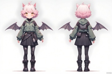 The image depicts an anime-style character with short, light-colored hair that transitions from pink to white. The character has small, pointed ears with pink tips, and they are wearing a futuristic outfit consisting of a black skirt, a green jacket, and black leggings. The character also has a pair of large, bat-like wings attached to their back, and they are wearing black combat boots with thick laces. The character's outfit includes various accessories, such as a utility belt with pouches and a device on their left thigh. The character's expression is neutral, and they are standing in a three-dimensional space with a plain background.