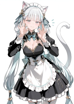Jinhsi,Jinhsi,Simple Flat Coloring,sketch,line,simple background,white background,1girl,solo,Character front,Tempting smile,Fortune Cat Gestures,breasts,looking_at_viewer,blush,bangs,simple_background,hair_ornament,long_sleeves,white_background,White silk stockings,dress,bow,animal_ears,cleavage,tail,frills,alternate_costume,hairclip,cat_ears,bowtie,mole,apron,black_dress,cat_tail,maid,maid_headdress,white_apron,_under_mouth,maid_apron,enmaided,face detail,masterpiece,best quality,absurdres,very aesthetic,collarbone,masterpiece,best quality,amazing quality,very aesthetic,absurdres,newest,