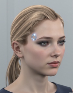 This is Chloe. She has a neatly - arranged golden ponytail with shiny hair,light blue circular button,Her makeup is exquisite, with deep - set eyes and naturally - colored lips. There is a light - blue circular switch button on her left temple, exuding a sense of technology.,Biomimetic robot,DTL,looking_at_viewer,there is a light blue circular button emitting light on the right eyebrow of the bionic human,The button is located at the temple, that is between the eyebrow and the edge of the hair,