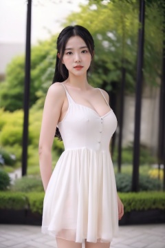 Realistic,(masterpiece:1.2),best quality,8K,HDR,RAW,depth of field,blurry,1girl,large breasts,((solo)),(delicate girl),(a garden of ethereal beauty flourishes,within a celestial realm,cinematic lighting,standing, ),(looking at viewer),(looking at viewer),<lora:add_detail:0.6>,<lora:GoodHands-vanilla:1>,   <lora:ENNE 白色吊带短裙_v09:0.75> ,white dress,