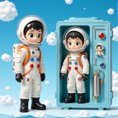 A set of photos of models, including two astronaut-shaped models, wearing transparent helmets, white space suits, black boots and orange safety ropes. The model on the left is in a walking position, while the model on the right is in a sky-blue storage box with a wrench, a signal light and an oxygen cylinder in it. The background is azure blue sky with white planetary patterns.