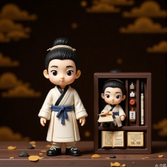 A set of photos of miniature landscapes, including two small statues of ancient scholars, wearing black square scarfs, moon-white robe, black cloth shoes and blue belt. The taller statue held the scroll and nodded slightly as if reading, while the shorter statue was in a dark brown wooden box with a brush, an ink ingot and a yellowed thread-bound book. The background is a quaint dark brown with golden cloud pattern.