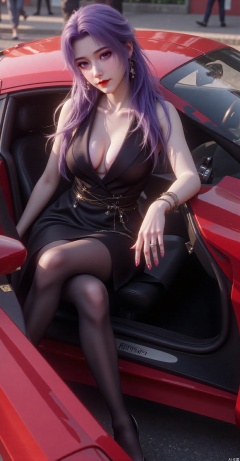 A girl,alone,with long hair,breasts,looking at the viewer,wearing a dress,with cleavage,adorned with jewelry,full breasts,sitting in the driver's seat of a red Ferrari,with purple eyes,long purple hair,wearing sexy black pantyhose,with a plump figure,mature and charming,wearing earrings,in delicate high heels,sleeveless,with nail polish,in a black dress,high heels,with fiery red lips,black pantyhose,wearing makeup,with lipstick,next to a Ferrari sports car,with red lips,a car,a sports car.