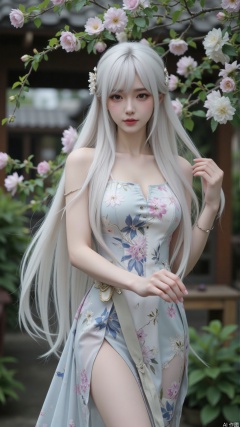 A portrait of an Asian woman with white long, flowing hair, wearing a traditional cheongsam (Chinese dress) in a subtle floral print. She's standing gracefully in a traditional Chinese garden, surrounded by lush greenery and blooming flowers. The overall mood is serene and peaceful, emphasizing the grace and elegance of the traditional attire. High resolution, 8k, soft lighting, hyperrealistic, photorealistic, detailed textures, elegant pose, serene expression, traditional cheongsam, natural beauty, trending on artstation.