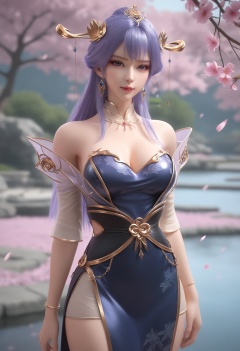 score_9,score_8_up,score_7_up,high detail,best quality,cinematic lighting,volumetric lighting,shiny skin,shiny,1girl,solo,long hair,earrings,hair_ornament,breast,dress,jewelry,long hair,purple hair,bare shoulders,shiny,detached collar,cowboy_shot,looking_at_viewer,solo focus,blurry background,depth of field,large_breasts,Tranquil garden pond surrounded by cherry blossoms,Vibrant cherry blossom park in full bloom,day,suneate,<lora:QQSponytianqiongV1:0.8>,<lora:Pony_DetailV2.0:0.8>,<lora:皮肤凹痕:0.1>,
