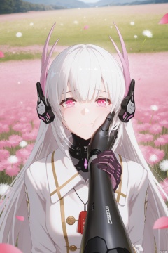 1girl,solo, liv-eclipse/(punishing gray raven),long hair, hair ornament, headgear, white hair,white coat, pink eyes,