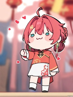 masterpiece,best quality,newest,absurdres,highres,very awa, danjin, danjin\(wuthering waves\), 1girl, long chinese dress, long sleeves, white socks, white skirt, braid buns, earrings, smile, chinese new year, black loafer, stickers, chibi, :3