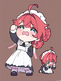 masterpiece,best quality,newest,absurdres,highres,very awa, danjin, danjin\(wuthering waves\), 1girl, maid_dress, long sleeves, white socks, maid_costume, braid buns, earrings,  black loafer, stickers, chibi, crying, tears, simple background,
