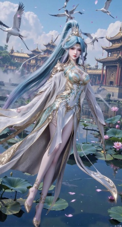SFW,(masterpiece:1.2),best quality,1girl,solo,long hair,long dress,celestial maiden in flowing tulle gown levitates above lotus pond, ethereal mist trails from hair ribbons, mythical Penglai paradise emerges through clouds with glowing pavilions, translucent bioluminescent lotus blooms, flock of cranes gliding over water surface, ultra HD with soft 3D rendering, morning light filters through mist, falling petal rain, intricate details on scale-patterned fabric and lotus veins.(huge breasts:2.99),(full breasts:2.99),,,XanmiaoyiY,XhuolingerHHY,XwangqiuerKQW,Xxuenv