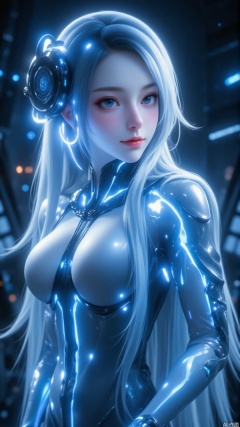 1 girl, alone, very long hair, white hair, closed mouth, smile, head-mounted visor, monitor, dark, blushing, head tilt. A stunning holographic AI assistant, glowing with futuristic blue and silver hues, sleek and sophisticated, wearing a stylish, form-fitting outfit with shimmering digital patterns. Her hair is soft and flowing, with a gentle holographic glow. The background is a futuristic control room filled with advanced technology and holographic displays. She appears to be reading brainwaves and emotions, with a calm and empathetic expression, ready to provide the best solutions and support. Highly detailed, ultra-realistic, 8K resolution, with a cyberpunk aesthetic and a touch of elegance.
