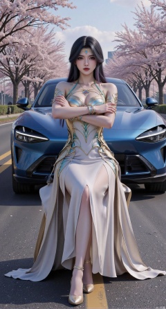 SFW,Best quality, masterpiece, 8k, 1 girl, sitting on the front headlights of a sports car, single, black hair, long dress, vehicle focus, crossed arms, brown eyes, armbands, long skirt, strapless dress, high heels, long hair,, full body, looking at the audience, chest, bare shoulders, blue sports car,Xyu7,.(huge breasts:2.99),(full breasts:2.99),(The road is lined with cherry blossoms, and the road is covered with cherry blossoms:1.29),XyueliuY,XchulingyuY,XliumeiY,XtianqiongY,Xaorun,XlishaoyinY,Xanmiaoyi,XhuolingerHHY,XwangqiuerKQW,Xxuenv