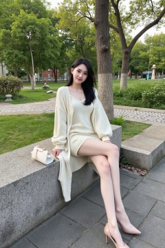 This is a high-resolution photograph featuring a young Asian woman with fair skin and straight black hair, seated on a stone bench in a park. She is wearing a cream-colored, ribbed knit dress that reaches her knees, and a matching oversized cream cardigan. She is also wearing nude-colored high heels. The background shows a serene park with lush greenery, trees, and a stone path. A small white handbag is placed beside her on the bench. The lighting suggests early morning or late afternoon. There are no visible JPEG artifacts.,<lora:models/4490/a2c5bb9d.safetensors:0.8:0.8>