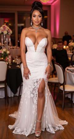 A stunning bride, with a dark skin tone, confidently poses at her wedding reception in an intricately designed strapless wedding dress with a deep plunging neckline that accentuates her curves, featuring delicate lace, sheer fabric, and elegant embellishments. Her hair is elegantly pinned up in a bun, with soft tendrils framing her radiant face. Her makeup is flawlessly applied, enhancing her striking eyes and full lips, exuding confidence and allure. She stands tall in glamorous platform high heels, exuding poise and sensuality. Her flawless makeup enhances her striking features, and sparkling jewelry—dangling earrings, a radiant necklace, and delicate bracelets—adds a hint of luxury. The reception venue glows with warm, ambient lighting, soft candlelight, and floral arrangements, creating a captivating contrast between bridal elegance and alluring confidence as she strikes a bold yet graceful pose, owning the moment with undeniable charm and allure.