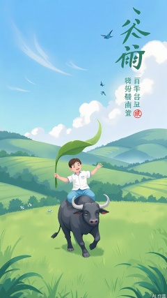 GYCH, A digital illustration of a young boy riding a water buffalo through a lush, green field. The boy is wearing a white shirt and blue pants, and he is holding a large green leaf above his head. The water buffalo has large horns and a calm expression. The background features rolling hills, a blue sky with light clouds, and a few birds flying in the distance. The image has a soft, pastel color palette and a whimsical, cartoon-like style. Chinese characters are written in the top right corner.