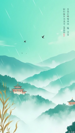 GYCH, A serene, digital painting of a traditional Chinese pavilion with red and green accents, set against a backdrop of misty, turquoise mountains. The scene is bathed in soft, diffused light, with gentle rain falling and a few birds flying in the sky. The foreground features some dry, golden grass. The painting has a dreamy, ethereal quality with a sense of tranquility and calm.